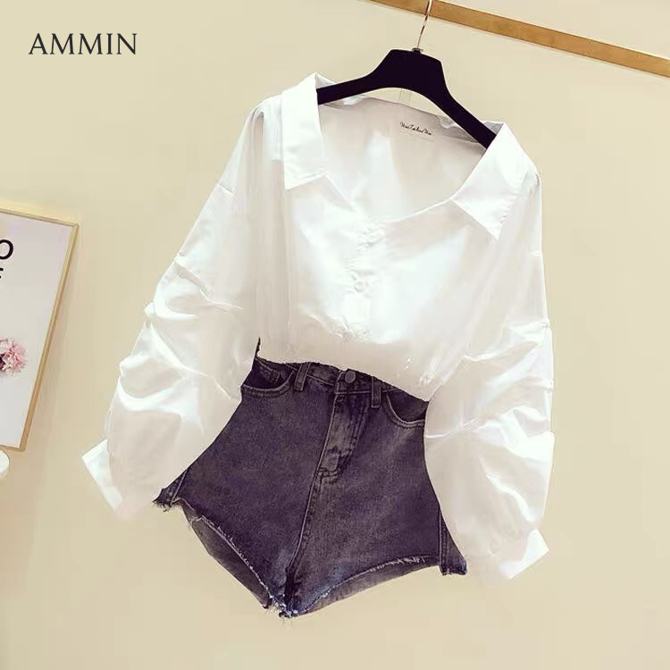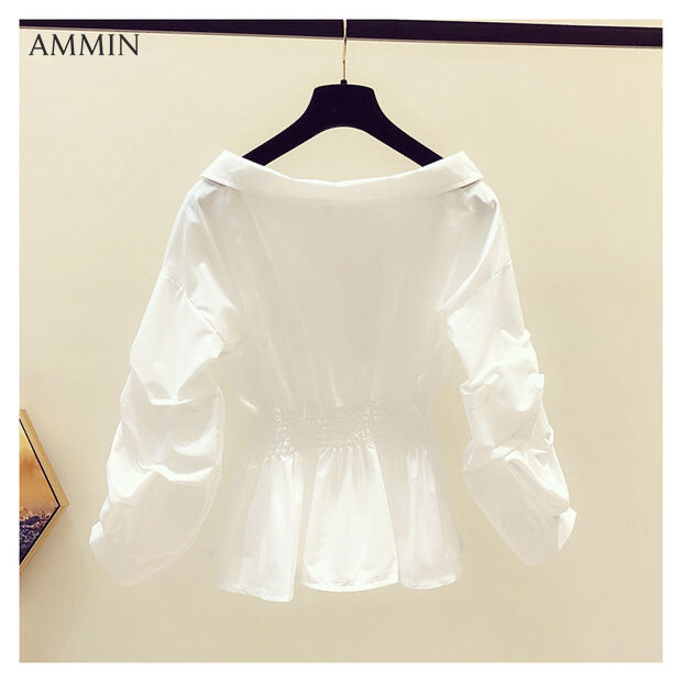 AMMIN Tops 2021 autumn new style V-neck long-sleeved button cardigan cotton shirt women's Korean version of retro Hong Kong flavor elastic waist Western-style loose lantern sleeves solid color blo