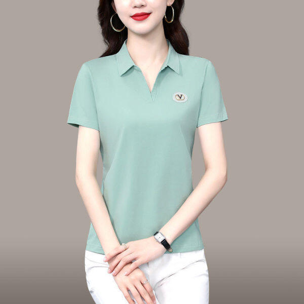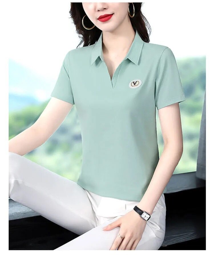 M-5XL Free shipping over size women sport polo shirt short sleeve slim basic plain v neck shirt ladies t shirt green fashion tops tees