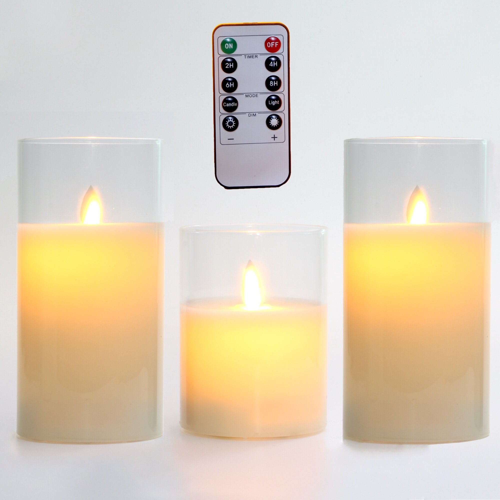 Glass Flameless Candles Set Real Wax Pillars & Moving Flame Wick LED Candles and 10-Key Remote Control with Timer, Battery Operated, Diameter 7.5cm