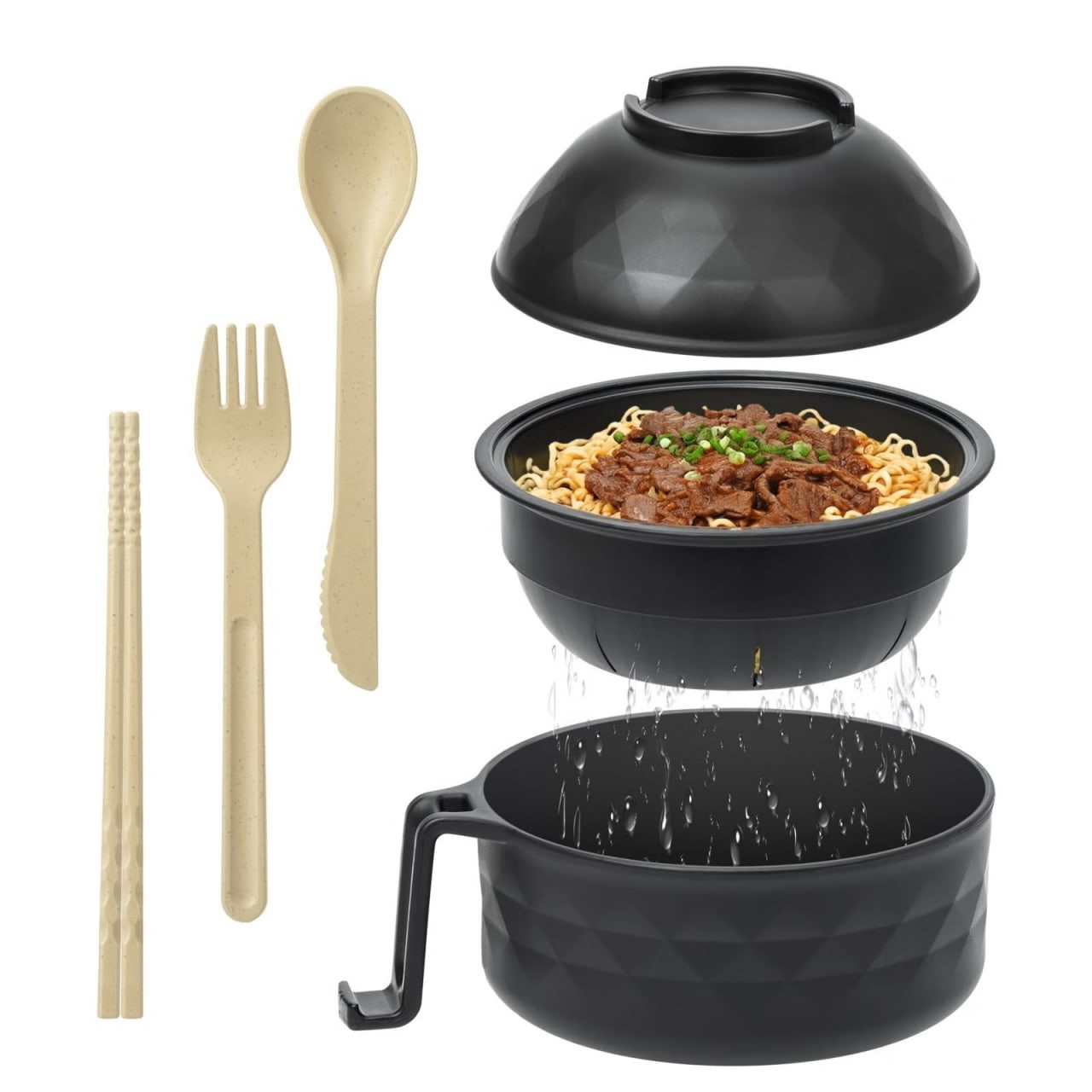Includes chopsticks, spoon, and fork! Can be used as a drain and phone holder